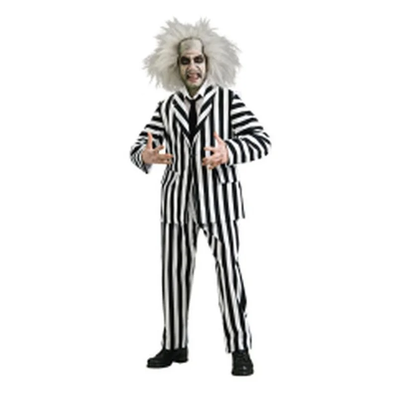 - Black and white striped pants in deluxe polyester, white long sleeved shirt and black neck tie