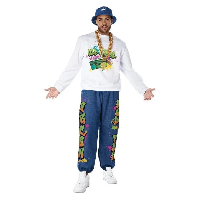 Be old enough to, or pretend to relive this vibrant 90’s street wear style. The 90’s Hip Hop costume comes with top with print “Old Skool”, pants with print “Fresh and Fly” and hat.