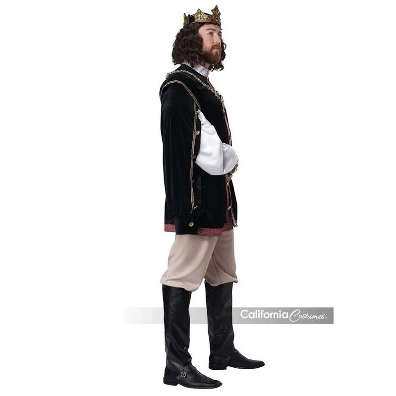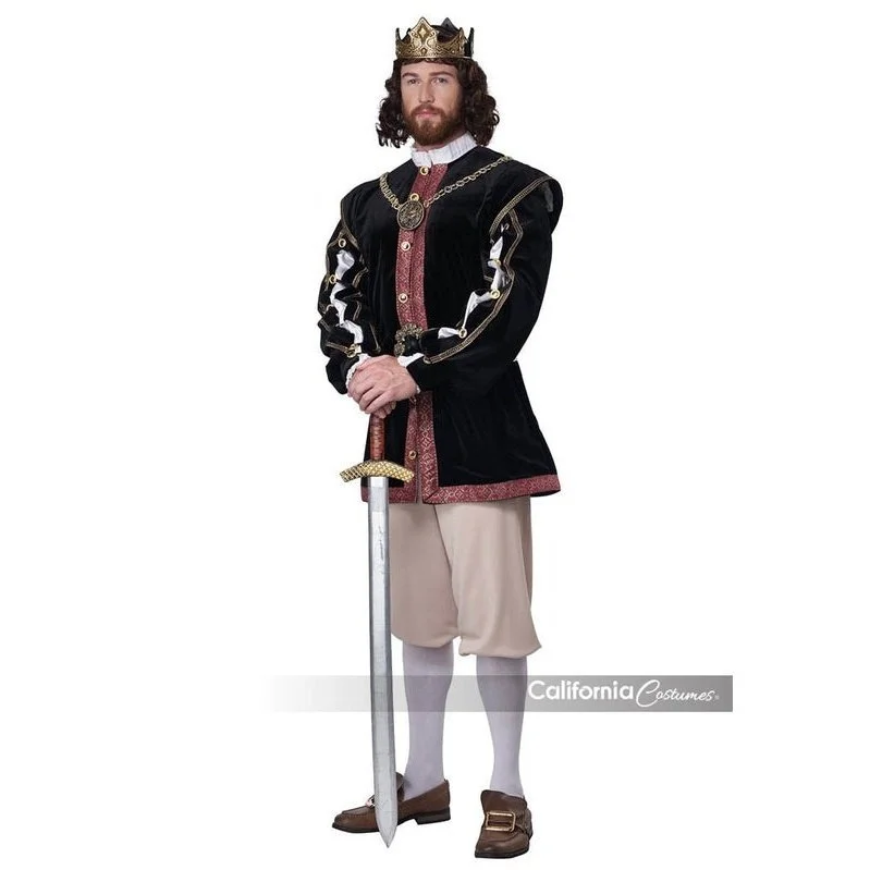 Product Description: The Elizabethan King costume is based on the ornate fashion style of royalty during the era. Features a button down jacket with attached white collar and button adjustable over sleeves with attached white under sleeves. It also includes a pair of knickers pants, a belt with decorative buckle, a gold fabric trim necklace with attachable lion pendant, a pair of boot covers, and a two piece Crown. Necklace can be attached up front with double chain loop.
