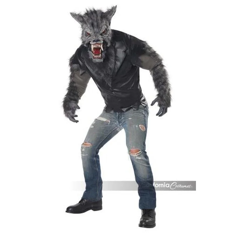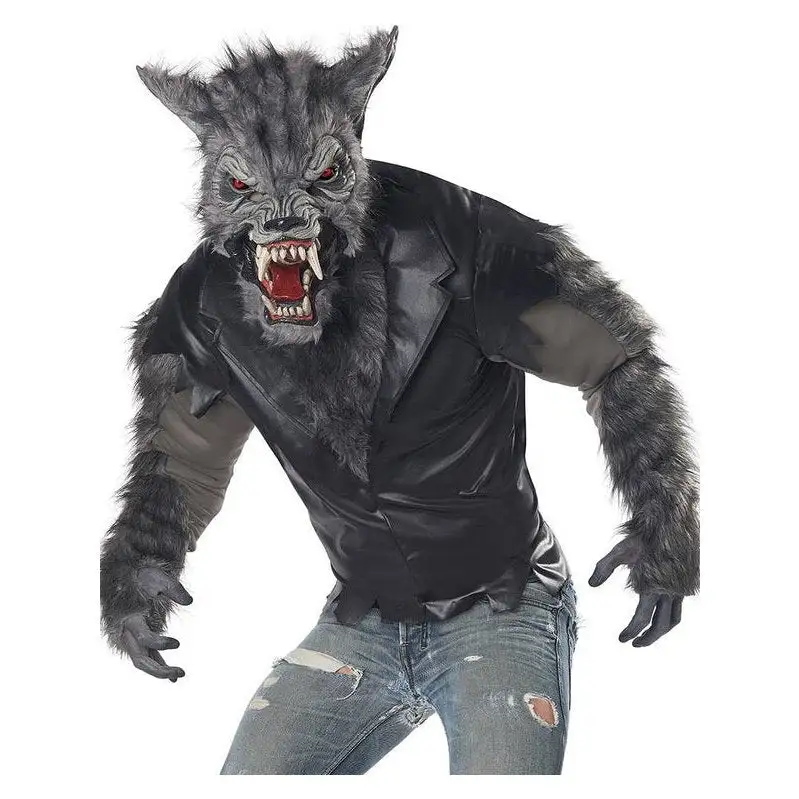 Let your inner wolf run rampage for the night and give it a bad boy touch with this Full Moon Fury Mens Costume. This terrifying costume comes with a grey full wolf mask with long sharp teeth, eerie red eyes and with a moveable lower jaw piece to really bring the mask to life. A character shirt which features a black leather looking vest with attached dark grey faux fur long sleeves and dark grey faux fur chest. To give extra effect the costume includes shoulder padding to give your look some extra size. Keep the wolf under control as you prowl the party on Halloween keeping your distance from the glowing full moon. Pair this costume up with your own pair of pants and shoes… and perhaps some fake blood for effect.