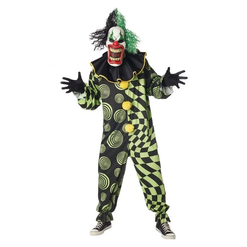 This is one fella you don’t want to meet when traveling through the circus, so give the other guests nightmares for days when you wear this Funhouse Freak Mens Costume for Halloween. This scary costume includes a black and green baggy jumpsuit with swirling patterns on the right side and on the left is an abstract checked design. The jumpsuit also features three yellow pom pom buttons down the front. The costume also comes with a large black with yellow edged frilled collar and a large clown half mask. The mask features a white face with a large open mouth grin which large yellow teeth, green paint around the eyes, a painted red nose and attached at the top and sides is green and black curly hair.