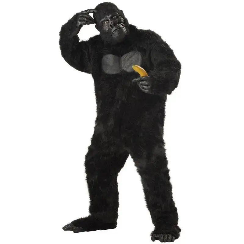 This Gorilla looks like a tough guy, but nothing a banana can’t fix. This one piece furry jumpsuit has matching fur on the mask, hands and feet, all included. You are well on your way to becoming king of the jungle.