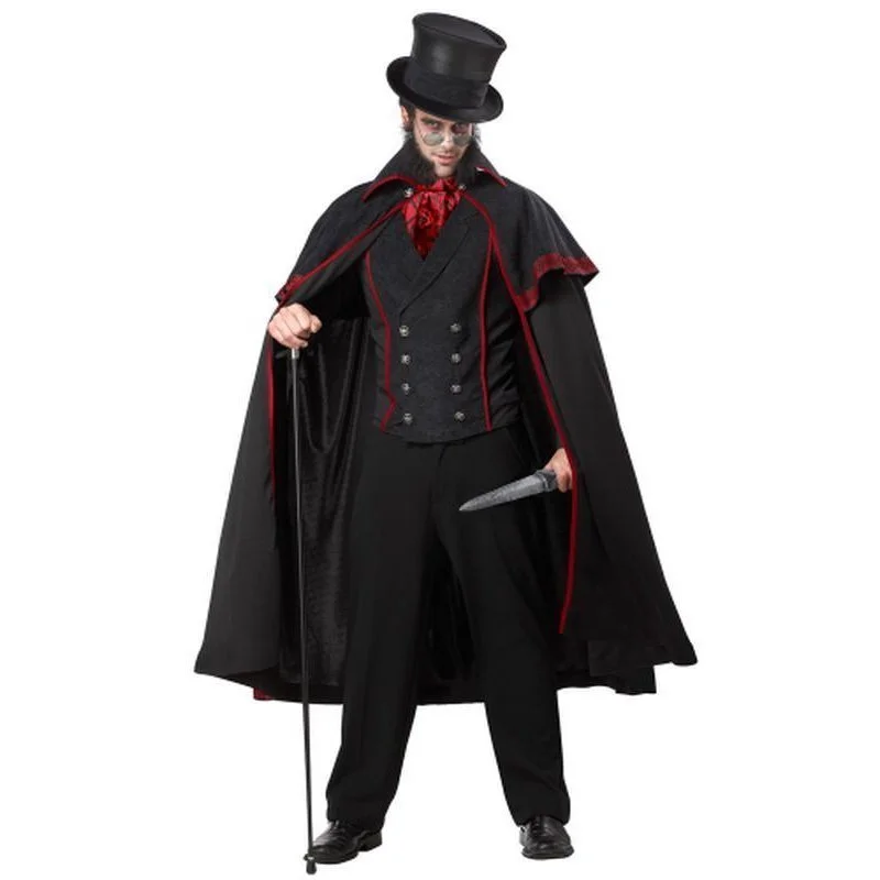 The costume includes black double breasted polyester vest with ornate silver buttons that button up the front. Crimson red trim and a black collar give the vest a gentlemanly look. The cloak features a faux leather mantle with red trim and with a collar, while the rest of the cloak flows down in a light weight black material. Elaborate Gothic designs decorate the red trim. The matching crimson red jabot features Gothic designs and buttons the cloak together and fits around the neck with a Velcro clasp. An elastic band around the brim of the hat helps ensure a comfortable fit.