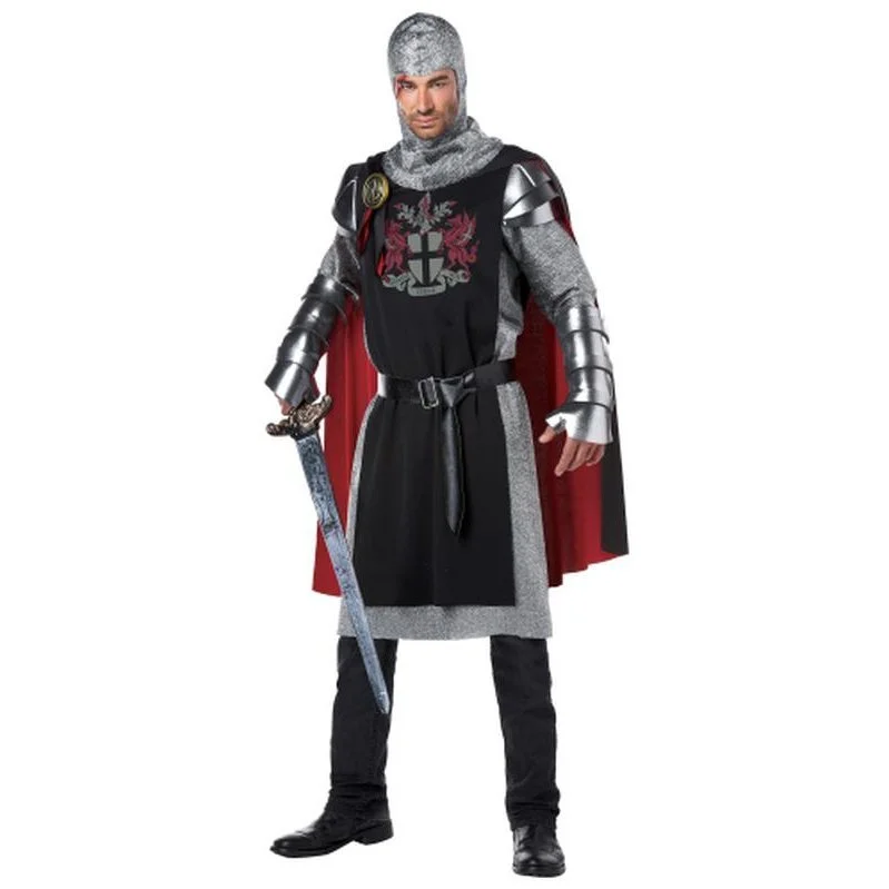 Go into battle and fight for your King with this Gallant Medieval Knight Mens Costume. This hardy fighter comes with a chainmail look hood, chainmail look sleeves attached to a black tunic with red crest, a double sided red and black cape with detachable medallion, armour like gauntlets and a black belt to hold it all together. Perfect for any medieval style party, the renaissance fair or any princess who wants a gritty prince.