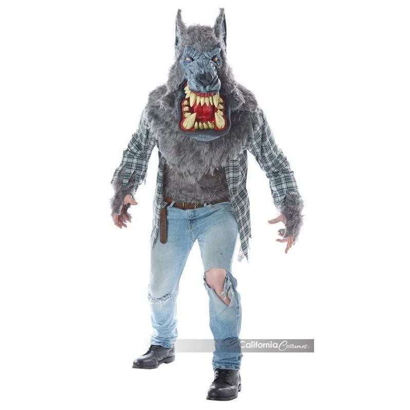 Product Description: It’s the biggest and meanest werewolf of the pack. The Monster Wolf werewolf costume set features a Big Mouth Mask with mouth opening action. The top is a shirt with attached faux fur chest, collar mane and sleeve ends. The Big Mouth Mask is two connected pieces. The lower jaw piece lays on the chest while the top is worn around the head. Nodding your head makes the mouth move.