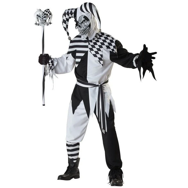 The dark carnival has come to town, dare you enter? Dress up in this excellent men’s evil harlequin Jester costume and play some devilish pranks at your next circus or Halloween fancy dress party! You will be no fool when you wear this sinister men’s black and white jester costume, perfect for tricking (no treating!) this Halloween.