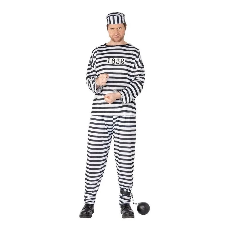 The costume consists of a black and white striped lightweight top with tie up neck. The trousers have a fully elasticated waist for comfort. Also included is a pillbox style hat with elastic fitting at the back. As a great accessory in this convict costume you get a sheet of sticker numbers from 0-9 so you can decide on a prisoner number that is individual to you.
