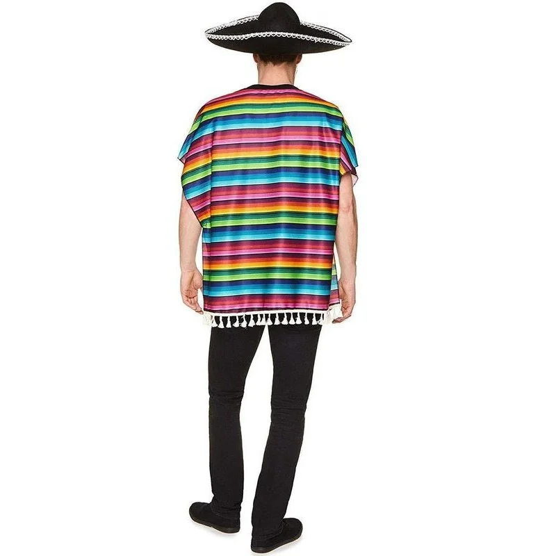 Get ready to stand out at your next Mexican themed party when you wear this rainbow stripe Mexican poncho. This poncho is made from rainbow striped stretchy polyester fabric. The poncho slips over your head, has open sides and has cream tassels along the bottom. Grab a large Mexican sombrero and your Mexican outfit is complete!Â