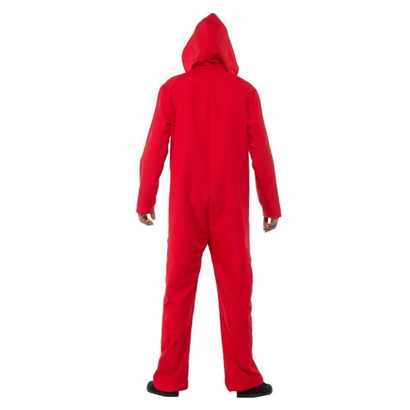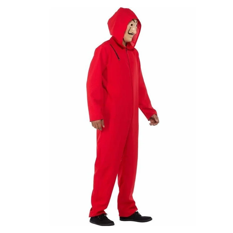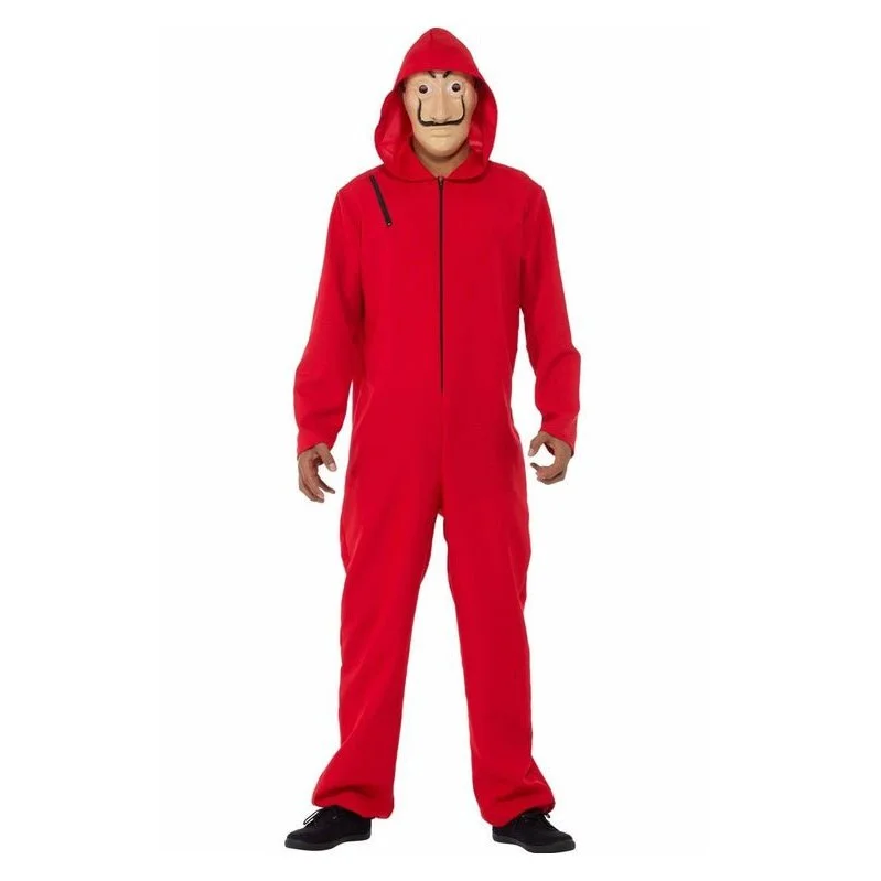 Perform the biggest robbery and dress in a full body disguise in this Money Thief Adult Costume. This costume features a red hooded jumpsuit with a black zip front and a smaller zipper on the right shoulder and t hide your identity is a Salvador Dali style half mask. Now let’s rob some banks.