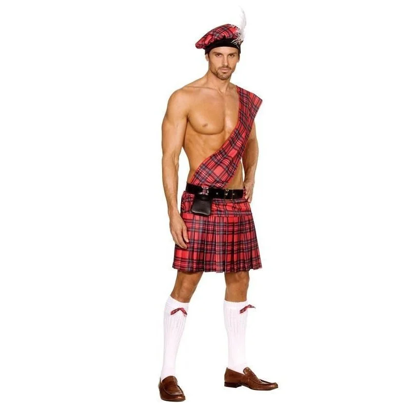 The lassies just won’t get enough when you stun them with this plaid pleated kilt with attached sash, matching hat, belt with bag and two sock garters. Dress it up with a shirt or leave it off for extra fun!
