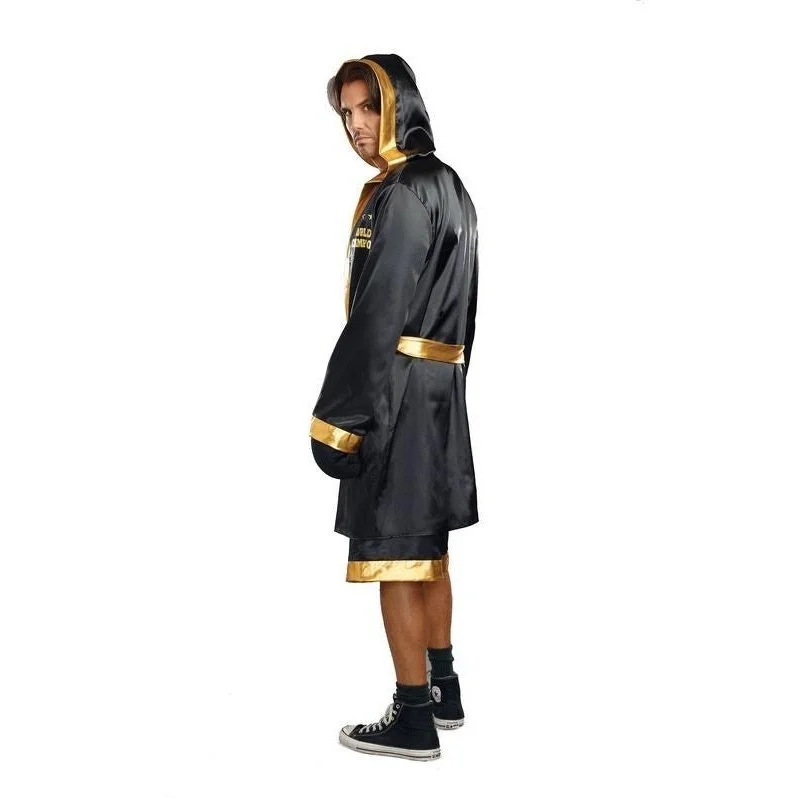 This World Champion boxer with his willing body, is looking for a ringside hottie. Black and gold satin robe with tie belt and gold metallic World Champion screen-print. Includes boxing gloves, shorts, and World Champion Belt.
