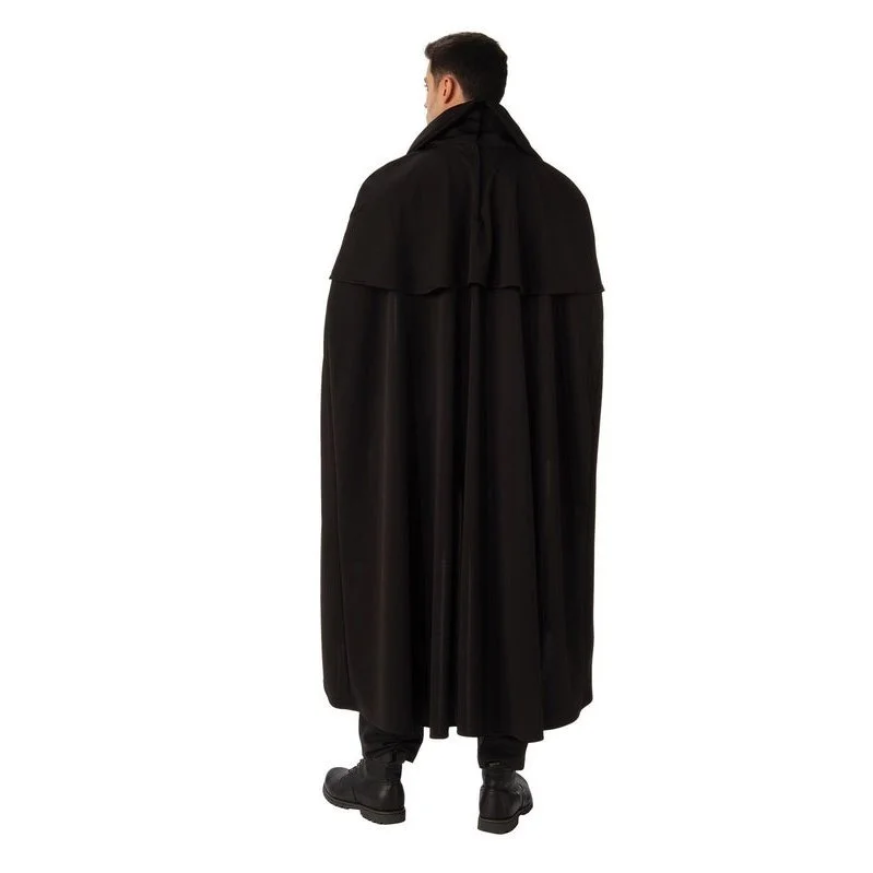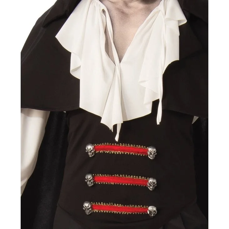 - Long black cape featuring high collar at rear and attached vest with painted silver skeleton buttons and red satin attachments