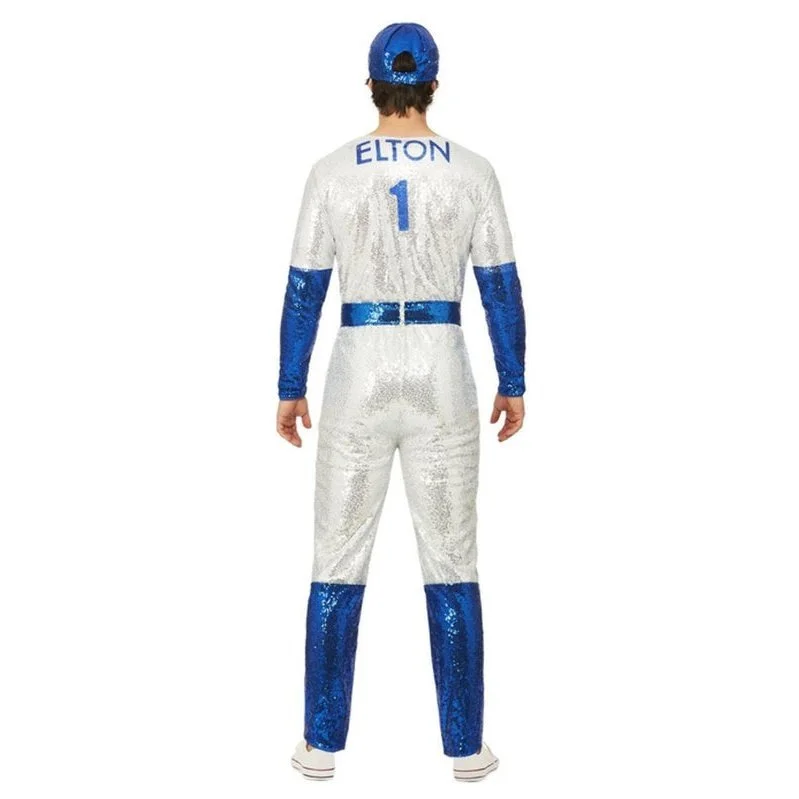 You’ll certainly hit a home run in this Elton John Sequin Baseball Deluxe Mens Costume. This fun costume is inspired by the one that Elton John wore in 1975 for his concert at Dodger Stadium. The costume comes with a silver sequin jumpsuit featuring blue sequin panels on the sleeves and legs, “Elton” in blue cursive across the chest, “Elton” and a number “1” in blue capitals across the back, and has a front zipper for closure. Also included is an adjustable blue sequin belt with a hook and loop fastener, as well as a blue sequin baseball-style cap with a silver “E” at the front. Add your own shoes and sit yourself down at the piano and you’re ready to serenade your party guests in style. Perfect for celebrity themed parties, 70s parties, sport themed parties and more.