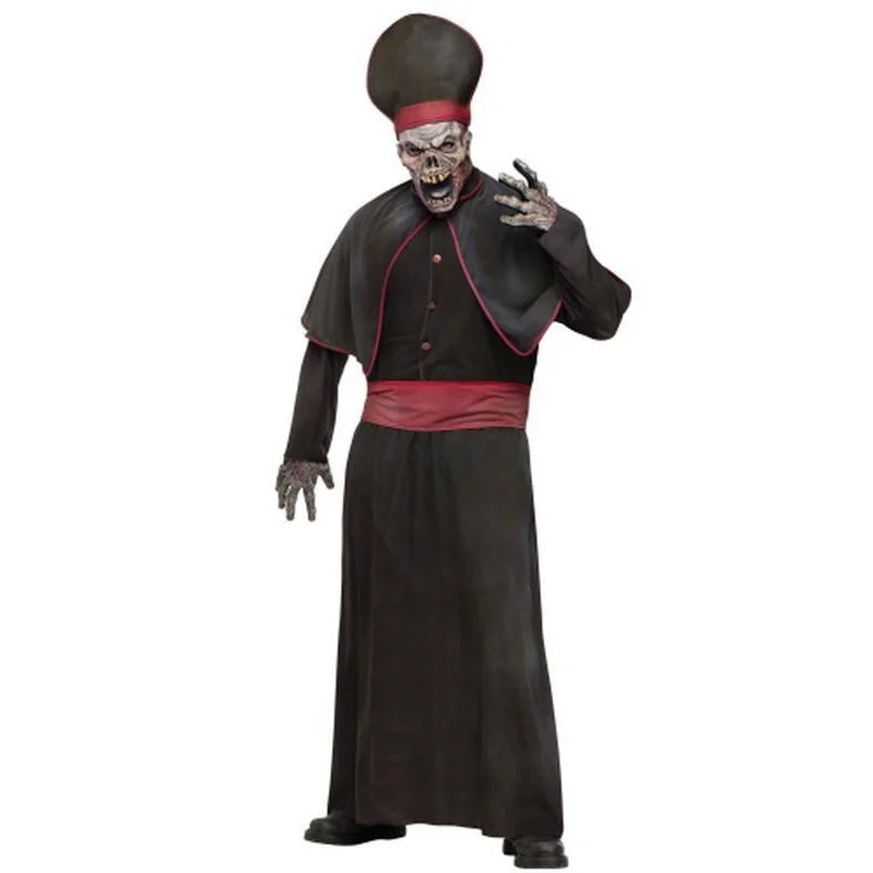Costume includes: Long Black Robe, Caplet, Cardinal Hat, Skeleton Mask and Gloves, & Belt