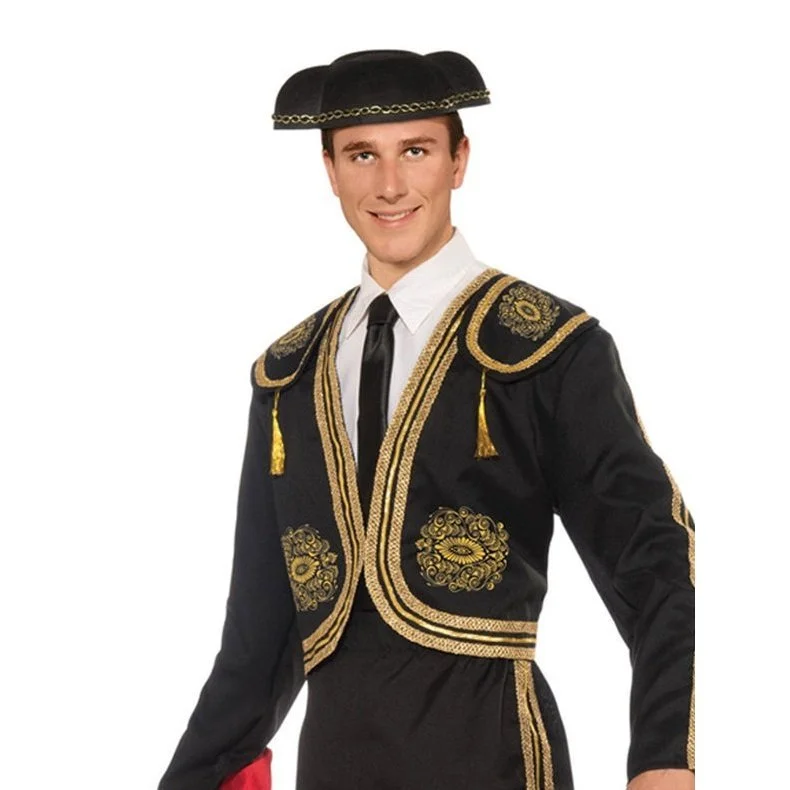 - Traditionally styled and printed black and gold Matador short jacket with shoulder pads and attached tassels