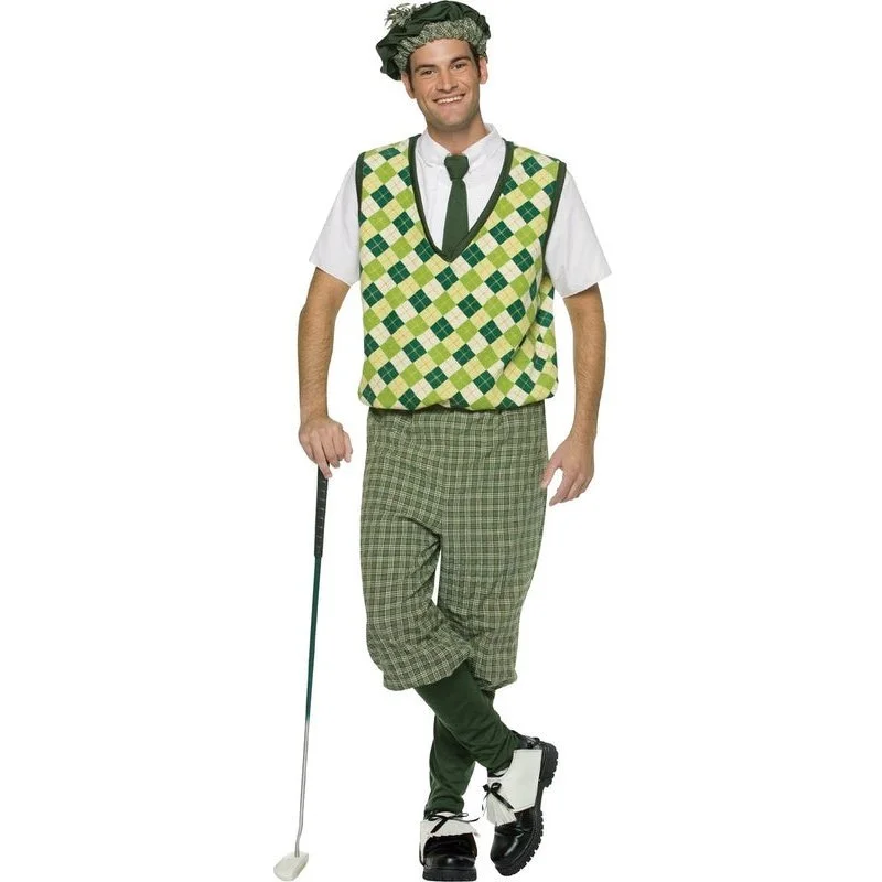 This Old Timey Golfer Costume will be a hole-in-one at the Halloween party or golf course. Costume includes sweater shirt with tie, knickers, sock/shoe covers, and beret. Just add your own golf club! One size fits most adults sizes 42-44. 100% Polyester. Care instructions: Do not wash, bleach, dry clean, or iron. Spot clean only.