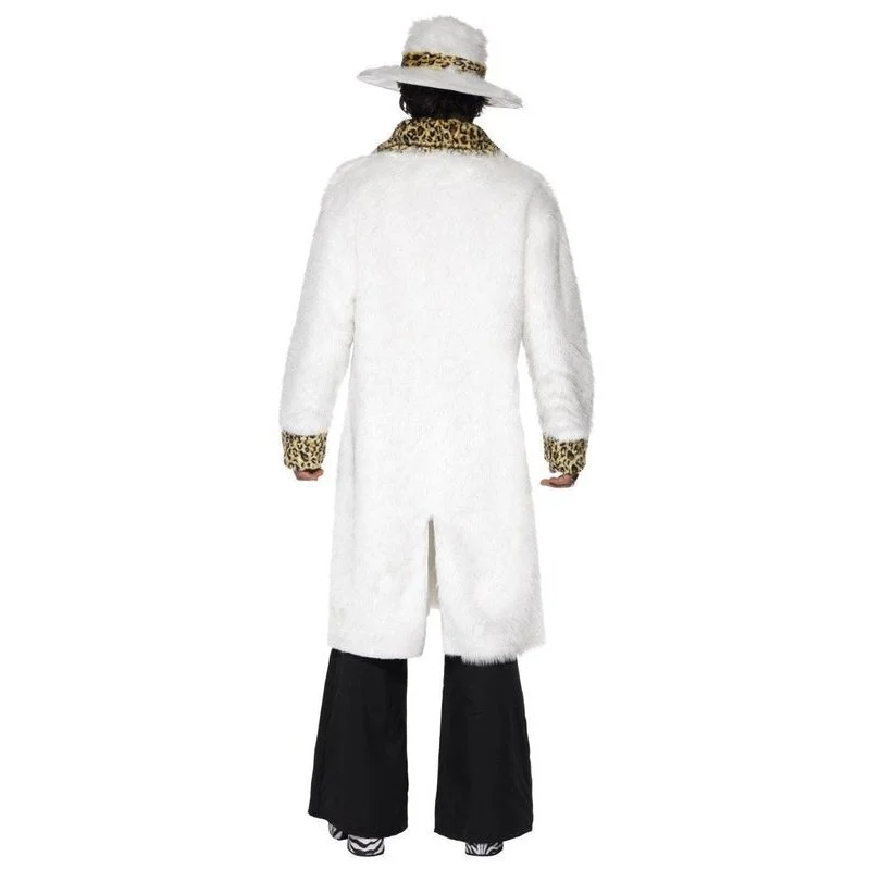 Pimp Costume, White and Leopard Skin, White, Faux Fur, Coat, Hat, and Trousers